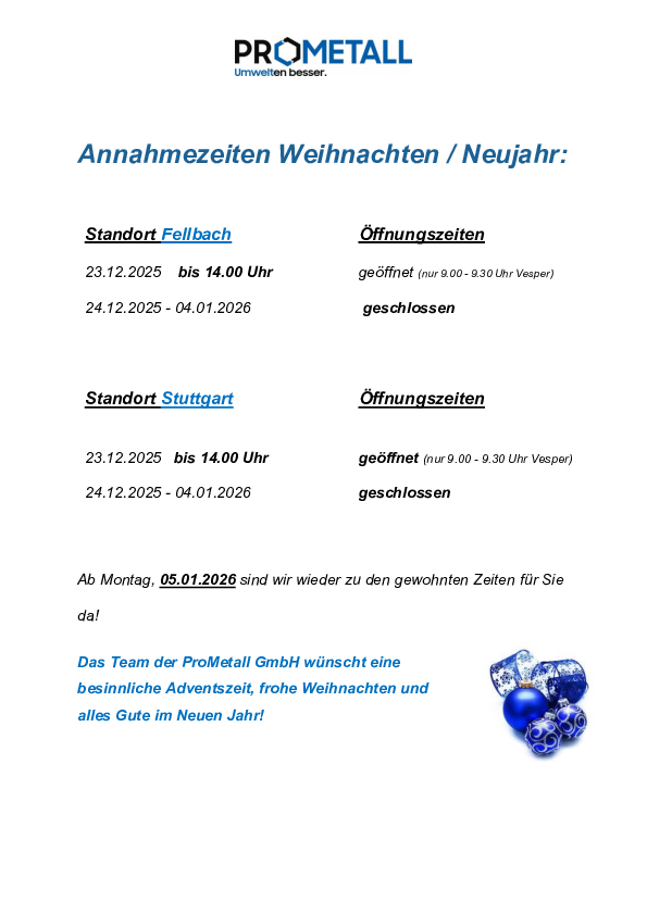 Das Team der ProMetall GmbH wünscht eine besinnliche Adventszeit, frohe Weihnachten und alles Gute im Neuen Jahr!